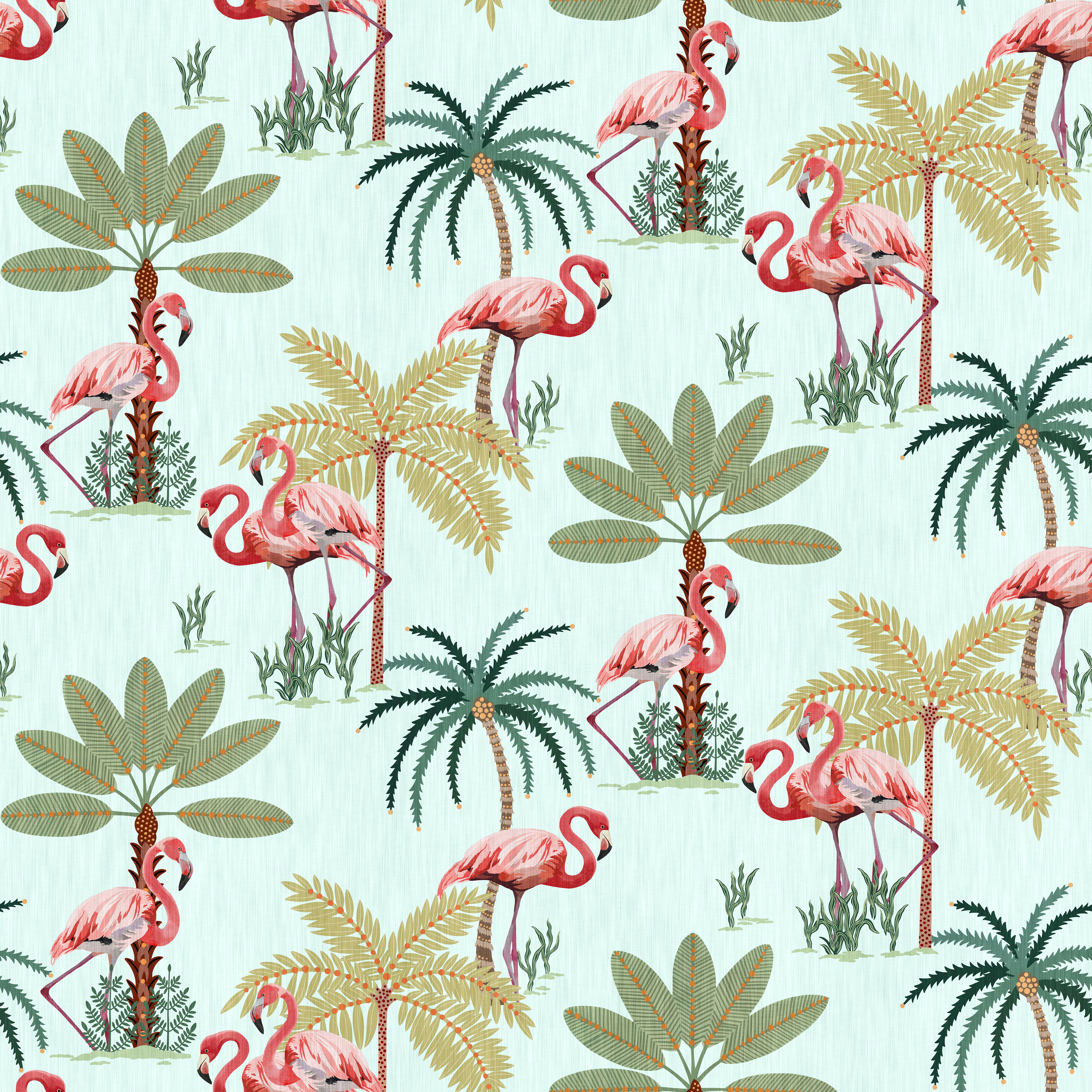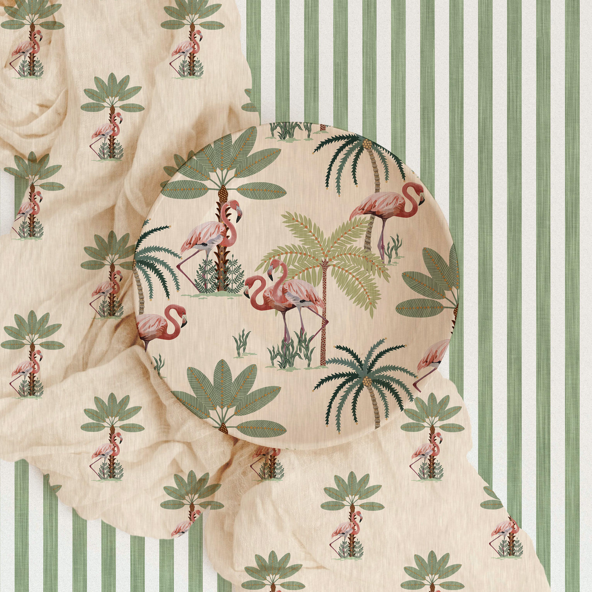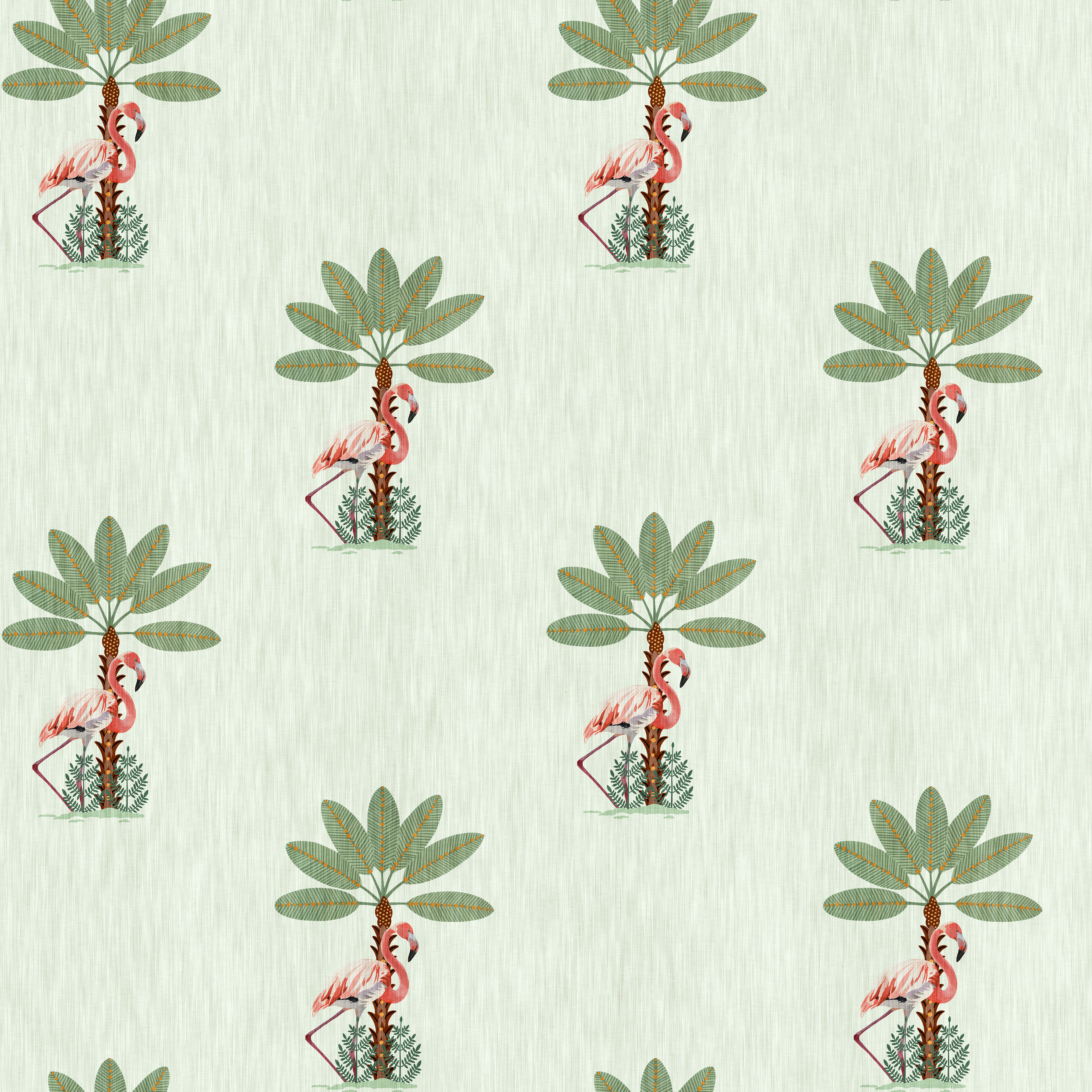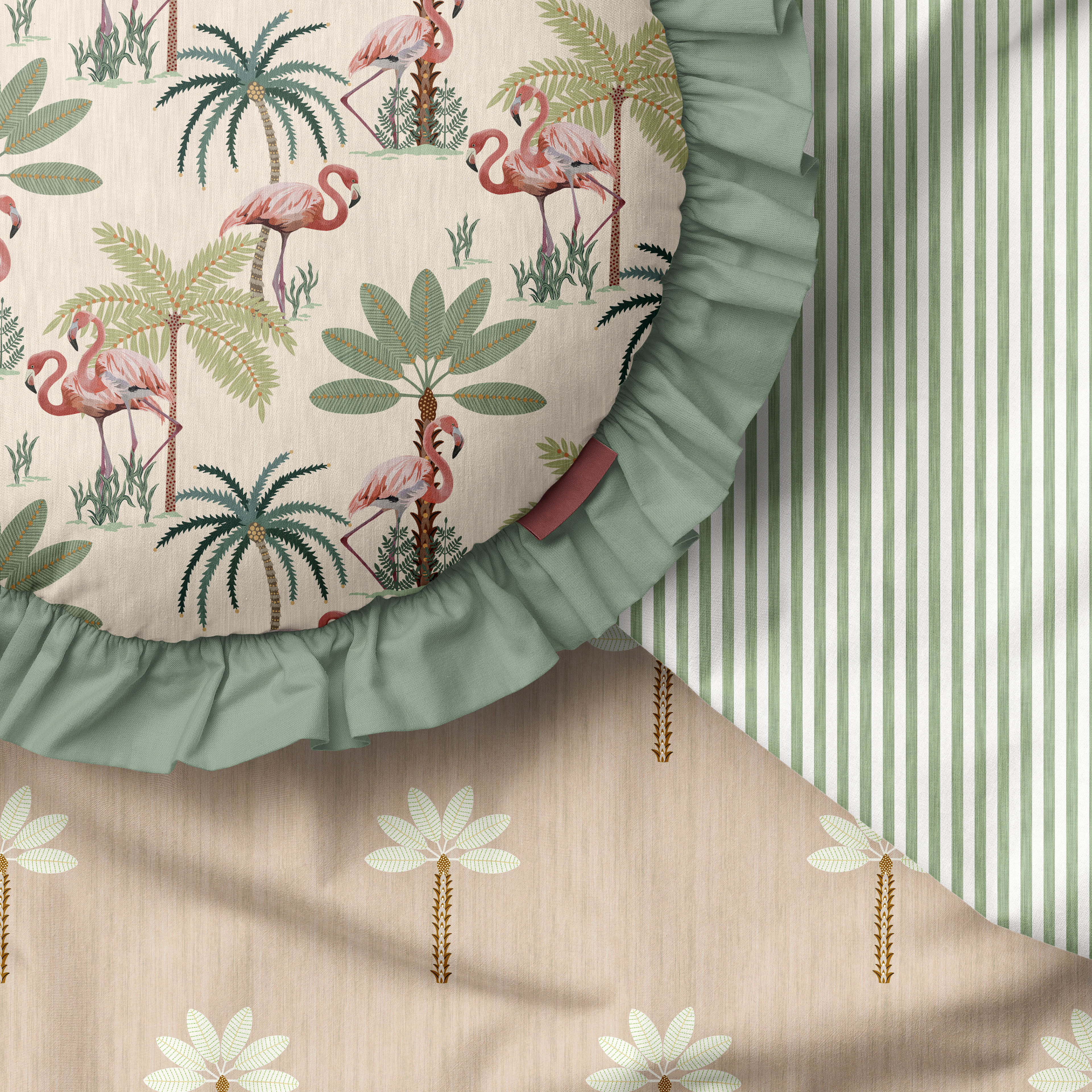 A tropical themed collection featuring vibrant flamingos and playful palm trees, perfect for children's rooms where soft pastel tones come together and their imaginations can run wild.